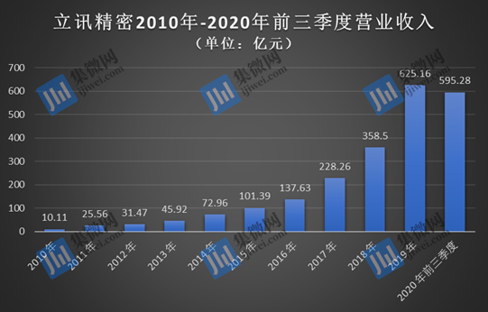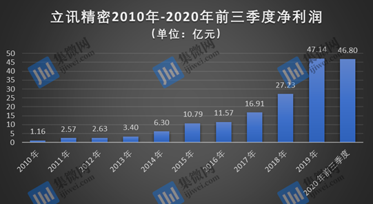 作为苹果最具代表性的产业链企业,最新财报显示,立讯精密2020年前三季度实现营收595.28亿元,同比增长57.33%;归属于上市公司股东的净利润为46.80亿元,同比增长62.06%。回顾2010年上市之初,立讯精密的营收为10.11亿元,归属净利润也仅有1.16亿元,与2019年625.16亿元的营收与47.14亿元的净利润相比,十年间,其营收翻了超60倍,净利润的增长幅度也达到了47倍。