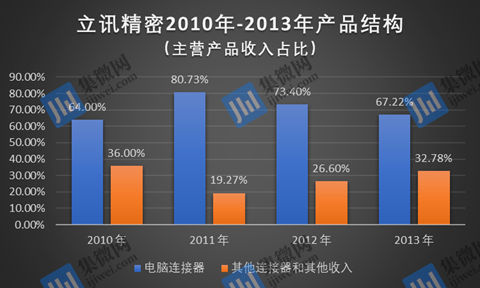 2013年对于立讯精密而言极为关键,自该年起,其围绕着将公司打造成为“全球领先的连接器及连接方案提供商”这一战略目标,在保持公司传统的PC业务稳步增长的基础上,积极布局服务器、通讯产品领域,并将开拓重心转到快速成长的智能移动终端市场。这一年,电脑连接器产品的营收占比缩减至67.22%,而非电脑连接器业务营收占比则超过了30%,两类业务的营收占比几乎又回到2010年的水平。