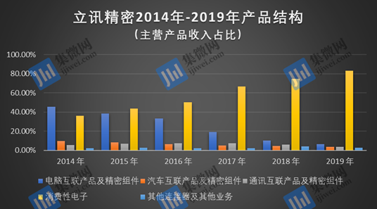 2014年,立讯精密基本完成了业务重心的转换,坚持以互联产品及精密零组件业务为核心,以服务大客户为基本方向,抓住智能移动终端市场快速发展的机遇,不断拓展和丰富产品线,主营业务为互联产品及精密零组件相关产品的研产销。这一年其产品分类也更加细化,细分为电脑互联产品及精密组件、汽车互联产品及精密组件、通讯互联产品及精密组件、消费性电子和其他连接器及其他业务。其中,主营的电脑连接器业务营收为33.25亿元,营收占比低于50%,而消费类电子业务为26.5亿元,营收占比超过36%。