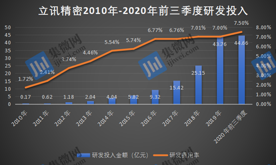 财报显示,十余年来,立讯精密持续加码对研发的投入,研发金额分别由2010年的0.17亿元增长至2020年前三季度的44.66亿元,上市至今的研发投入累计高达152.18亿元。研发费用率也同样逐年上升,由2010年的1.72%增长至2020年前三季度的7.50%。截至2019年底,立讯精密的研发人员数量达12809人,较上年同比增加76.36%。