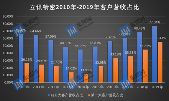 十余年来,立讯精密的消费性电子业务之所以能够实现快速增长,无疑在于和苹果的深度合作。从客户来看,数据显示,2010年至2019年,立讯精密前五大客户占当期营业收入比例经历了先降后升的波动。2010年至2014年,其前五大客户营收占比由65.67%下降至44.90%;自2015年至今,前五大客户的营收占比则持续上升,由48.81%增长至77.04%。