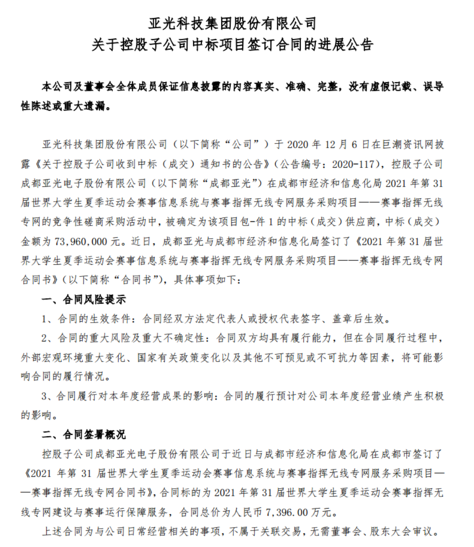 12月22日,亚光科技发布公告称,控股子公司成都亚光电子股份有限公司于近日与成都市经济和信息化局在成都市签订了《2021年第31届世界大学生夏季运动会赛事信息系统与赛事指挥无线专网服务采购项目——赛事指挥无线专网合同书》。