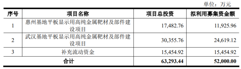 江丰电子本次发行拟募集资金总额不超过52,000.00万元(含52,000.00万元),扣除发行费用后,拟用于惠州基地平板显示用高纯金属靶材及部件建设项目、武汉基地平板显示用高纯金属靶材及部件建设项目以及补充流动资金。
