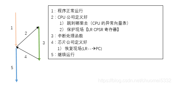 根据示意图,可知道当有中断请求时,首先进行保护现场,然后跳到中断处理函数,执行中断处理函数当中的程序,最后进行恢复现场,程序继续运行。