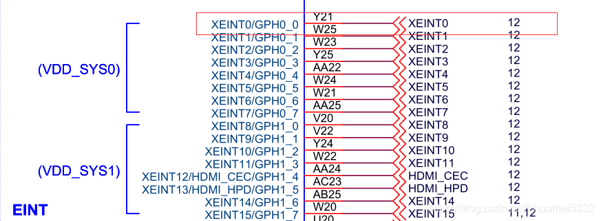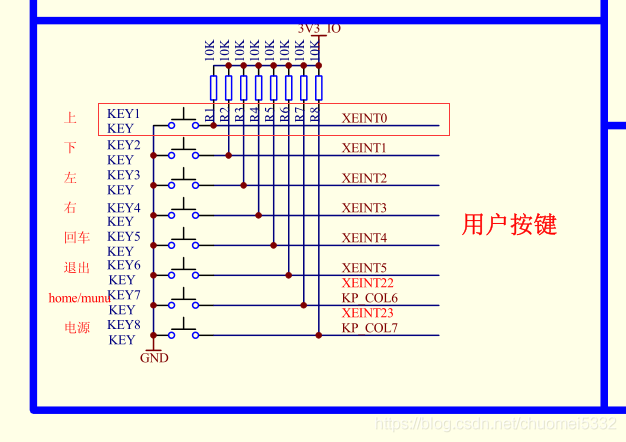 通过查询开发板原理图得知,按键连接的为外部中断XEINT0,连接的芯片引脚为GPH0,具体细节如下图。