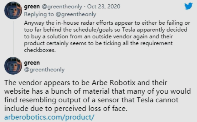 2020 年 10 月,专门研究特斯拉软件的黑客“green”在软件更新中发现了新功能的暗示,他提醒消费者们,在特斯拉最近的软件更新中增加了一个名为“Phoenix”的新雷达选项,Phoenix 是 Arbe 雷达系统的名字。它可通过 4D 超高分辨率实时成像,识别、评估和应对从普通到特殊的挑战场景,服务于现实世界的驾驶需求。
