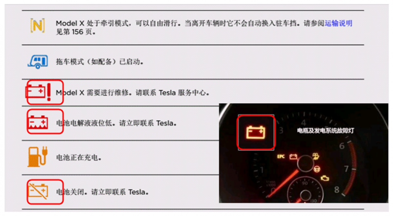 Model X 和燃油车的电池故障标识