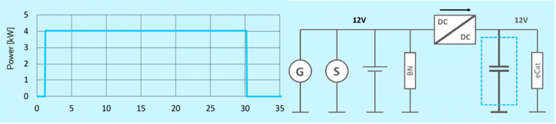 ·电催化剂加热:目前的解决方案是利用三元催化转化器燃烧燃料的办法来加热废气,30 秒平均需要 3kW 功率,每 KL15(发动机点火信号)循环激活一次,在凉车情况下,电池无法满足性能要求。超级电容器具有优良的低温功率性能,非常适合这种场景。
