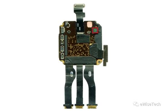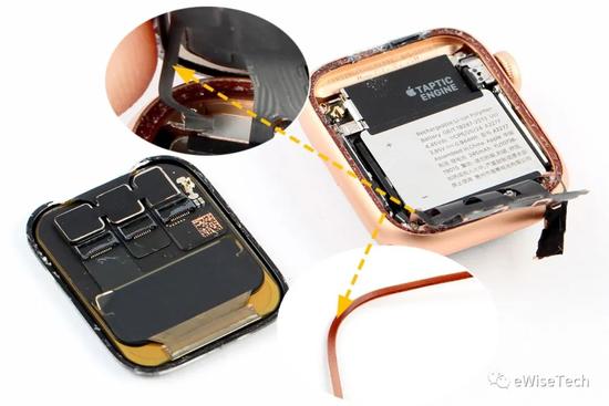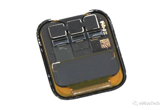 在拆解 Apple Watch SE 时,看到手表屏幕与主机之间并没有之前一直出现的力反馈线圈,仅是一圈厚实的防水密封胶,用来填充屏幕与表壳间的台阶间隙并增强防水作用。固定三条从主板延伸出的软板与屏幕背面的 ZIF 接口相连。
