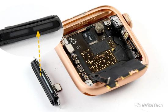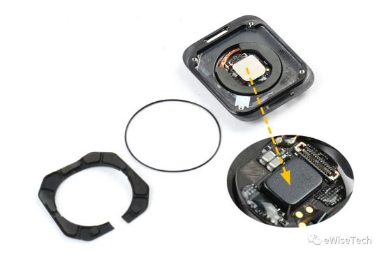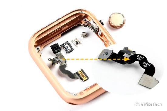 AppleWatch SE 表冠结构和前两代一样,但是由于 Watch SE 不支持 ECG 检测功能,所以表冠软板背面的芯片也就没有了。