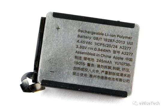 3.85V,245mAh 锂聚合物电池,电池型号:A2227。采用亮银色铝壳封装。与 S5 中所用的电池为同一型号。