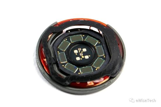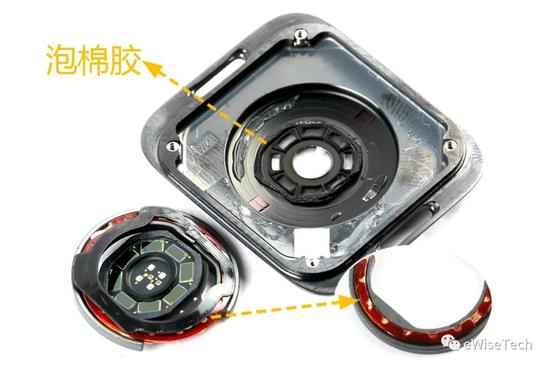 心率小板以及充电线圈与底壳使用泡棉胶固定,底壳传感器视窗内有镜片。充电线圈外保护壳面积明显增加,线圈底部有一层半透明的塑料壳隔绝线圈下方的黑色软板。
