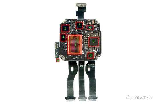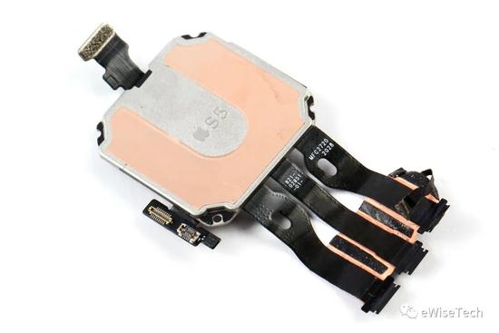整体沿用了 Apple Watch S5 的外形和硬件布局,但由于功能的删减,在充电线圈,心率软板和表冠软板上有些差异。由于采用防水设计,并且取消了反馈线圈,所以屏幕与表壳之间的用上了很厚的一层密封胶。只起到填充和密封的作用。主板依然为 SIP 封装。由于这次拆解的版本不支持蜂窝网络。所以 Apple Watch SE 中,并没有 E-SIM 芯片、基带芯片以及相关 RF 功能芯片。
