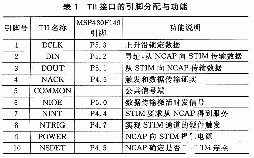 TII接口 (Transducer Independent Interface)用于连接NCAP与STIM,是一种点对点、短距离时钟同步的标准接口。该接口主要基于SPI(Setial Peripheral Interface)协议,并在该协议的基础上通过扩展功能实现10线智能变送器独立接口。本设计根据IEEEl451.2标准中对TII接口的定义,利用MSP430F149中的同步串行接口与外围I/O中断接口来设计实现这一过程,其引脚分配与功能定义如表1所列。