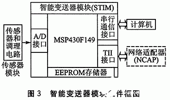 TI公司生产的16位单片机MSP430F149作为智能变送器(STIM)的微控制器,外围电路主要包括A/D接口、TII接口、RS一 232串行通信接口以及基于I2C总线协议的EEPROM存储器。图3为硬件设计的基本框架。图中传感器模块独立于STIM模块,二者通过A/D接口相连接。虚线部分为网络适配器模块,这里不对网络适配器模块的相关内容进行介绍。
