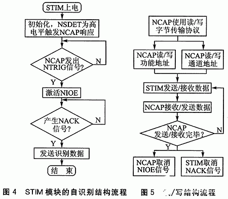 在智能变送器模块的软件设计中,最主要的工作是STIM模块的自识别讨稗和与NCAP之间的基本通信过程。图4和图5分别给出了STIM模块自识别和读/写结构流程。具体而言,整个软件被分为如下5大模块: