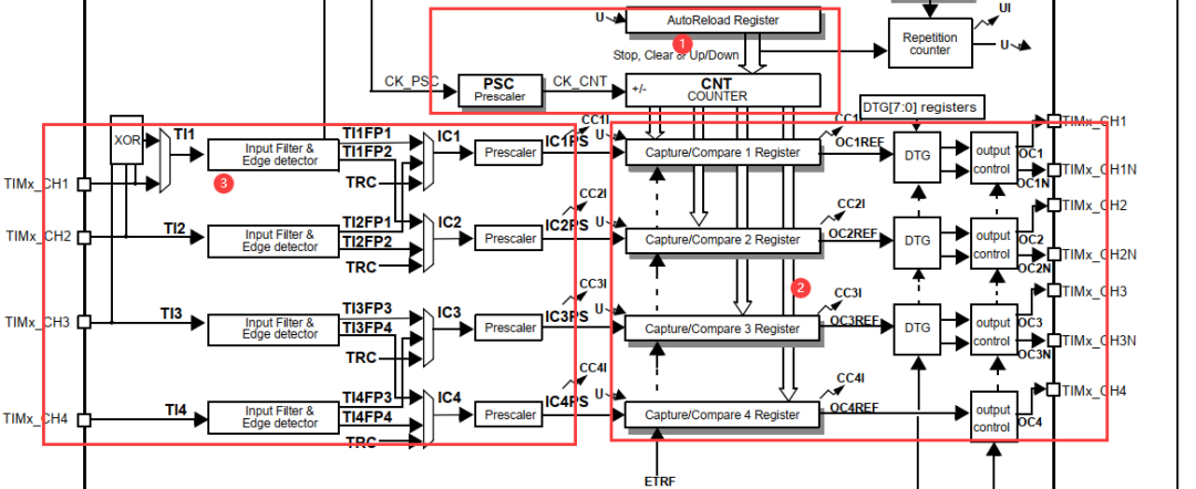 ②部分捕获/对比通道模块,已经在《定时器的PWM功能》讲解过了。