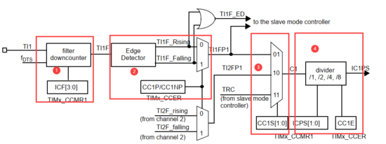 输入阶段采样对应的对输入TIx,去产生滤波后的信号TIxF。然后极性选择边沿检测器产生一个信号(TIxFPx),这个信号可以被用于服务模式控制器的触发输入或在作为捕获命令。在捕获寄存器前被预分频。
