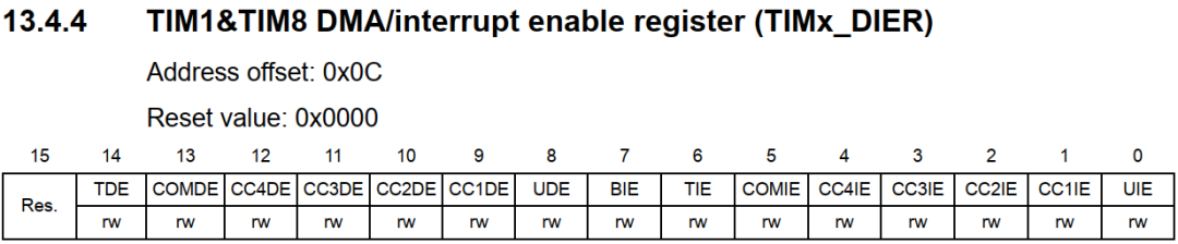 最后我们还需要设置中断,使系统快速响应输入捕获信号,主要是这只TIMx_DIER寄存器,如下: