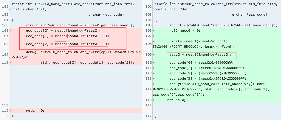 对比文章1和文章2,在函数中s3c2440_nand_calculate_ecc中,读取NFMECC0方式不一样。