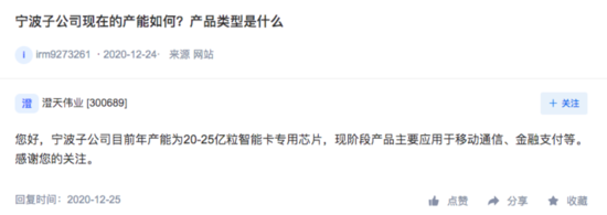 2020年12月28日 | 澄天伟业:宁波子公司智能卡芯片年产能为20-25亿粒