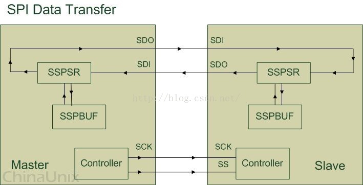 上图只是对 SPI 设备间通信的一个简单的描述, 下面就来解释一下图中所示的几个组件(Module):