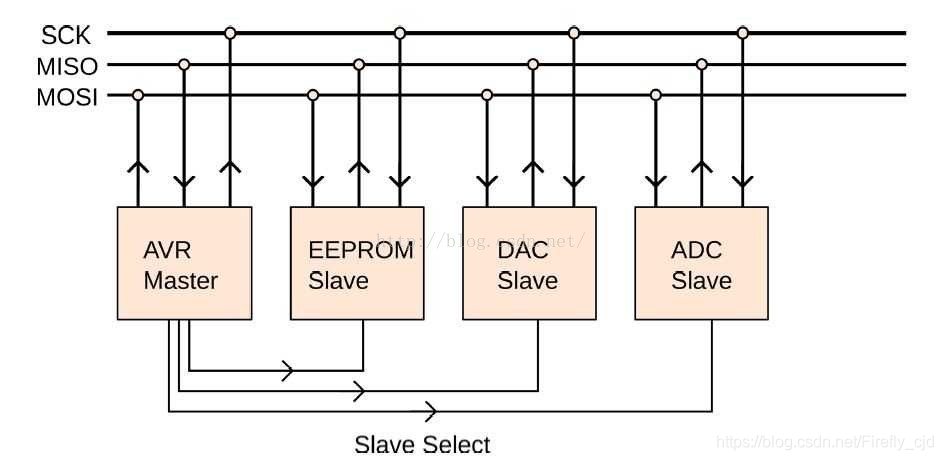SPI 规定了两个 SPI 设备之间通信必须由主设备 (Master) 来控制次设备 (Slave). 一个 Master 设备可以通过提供 Clock 以及对 Slave 设备进行片选 (Slave Select) 来控制多个 Slave 设备, SPI 协议还规定 Slave 设备的 Clock 由 Master 设备通过 SCK 管脚提供给 Slave 设备, Slave 设备本身不能产生或控制 Clock, 没有 Clock 则 Slave 设备不能正常工作。