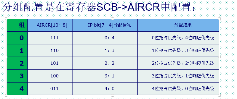 每个IP寄存器的高4位用来设置抢占和响应优先级(根据分组),低4位没有用到。