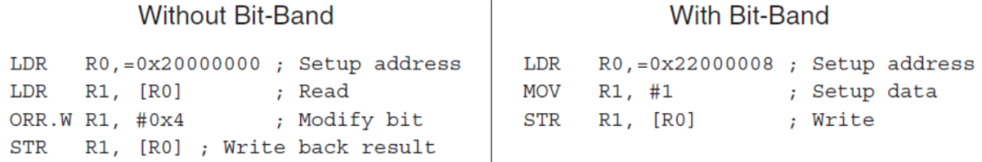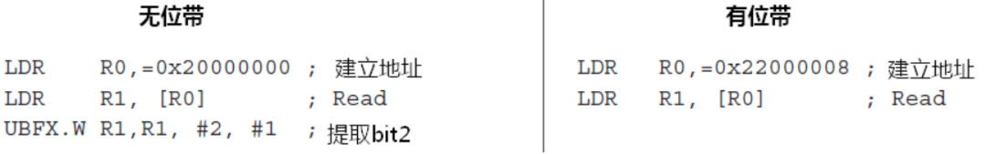 当你使用位带功能时,要访问的变量必须用 volatile 来定义。因为 C 编译器并不知道同一个比特可以有两个地址。所以就要通过 volatile,使得编译器每次都如实地把新数值写入存储器,而不再会出于优化的考虑。