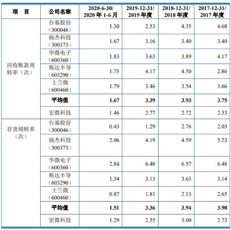 而且,宏微科技的存货周转率较上述同行企业低。2017年至2020年1-6月报告各期,公司存货周转率分别为2.73次、3.00次、2.55次、1.29次,均低于上述5家同行业上市公司的平均值3.90次、3.94次、3.36次、1.51次。