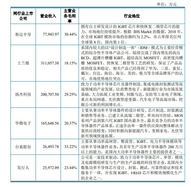 此外,与同行企业相比,宏微科技的营业收入与其他同行业上市公司相比存在一定差距。在招股书中,宏微科技将斯达半导、士兰微、扬杰科技、华微科技、台基股份等列为可比公司,2019年,上述公司实现营收分别为7.80亿元、31.10亿元、20.07亿元、16.56亿元、2.64亿元,均高于宏微科技2.60亿元的营收额。宏微科技表示,公司营收规模不如同行的主要原因是士兰微、扬杰科技和华微电子等公司主营业务均涉及功率半导体芯片、器件制造和集成电路封装测试等。不过,若竞争对手利用其品牌、技术、资金优势,加大在公司所处市场领域的投入,可能对公司市场份额形成挤压,使得公司产品收入下降,从而影响公司的销售规模和盈利能力。