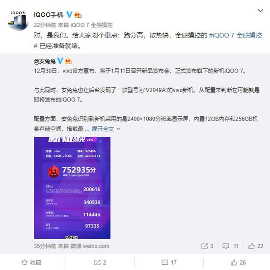 2020年12月31日 | 骁龙888手机iQOO 7性能跑分曝光:超过75万