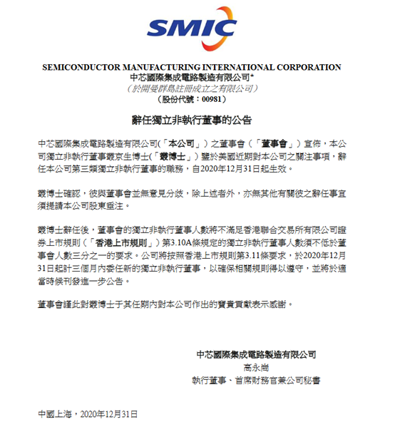 12月31日,中芯国际(00981.HK)发布公告,公司独立非执行董事丛京生博士鉴于美国近期对公司的关注事项,辞任公司第三类独立非执行董事的职务,自2020年12月31日起生效。