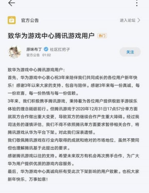 1月1日上午消息,华为游戏中心社区发布公告,因腾讯游戏单方面就双方合作做出重大变更,导致双方的继续合作产生重大障碍,华为将腾讯游戏从华为平台下架。