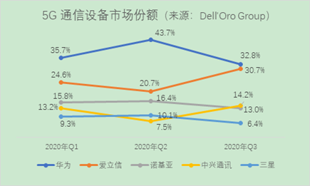 根据Dell’Oro Group统计,截至2020年第三季度,爱立信的5G通信设备市场份额达到30.7%,与排名第一的华为仅相差2.1%的份额。而中国是全球最大的5G通信设备市场。据工信部副部长刘烈宏去年11月披露,中国建成全球最大5G网络,5G基站达70万个,占全球比重近7成,连接超过1.8亿个终端。若失去中国市场份额,对于爱立信而言无疑是重大打击。据报道,爱立信在中国5G市场占有约10%的份额,该公司的业务也严重依赖中国的分包商。