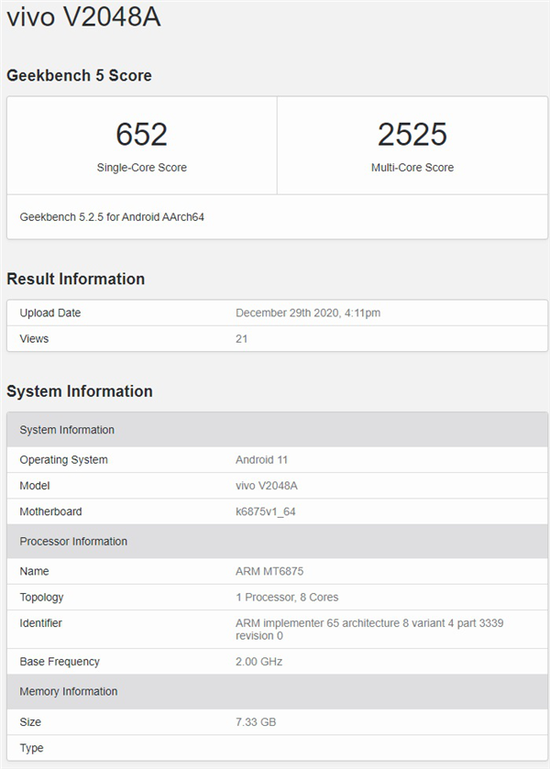 1月1日消息,今日一款vivo神秘新机Geekbench基准测试成绩曝光,数据显示该机型号为vivo V2048A,搭载联发科天玑820处理器,单核652分,多核2525分。