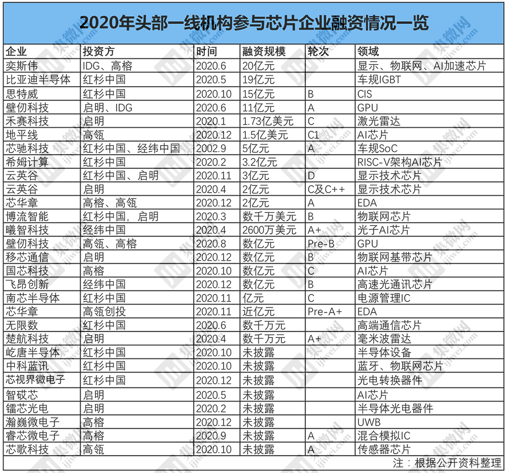 除了小米产投、华为哈勃、中芯聚源等产业资本的频频出手之外,国内半导体投资在2020年被激发了新活力,推动者来自红杉中国、IDG等为代表的一线投资机构。