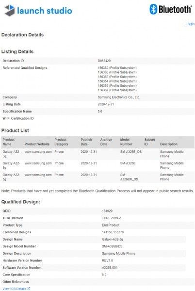 1月3日消息,三星Galaxy A32 5G近日在Bluetooth SIG现身认证,网站曝光了三星A32 5G的三个型号名称,分别是SM-A326B_DS,SM-A326BR_DS和SM-A326B。