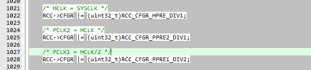 这三行代码首先是讲AHB总线时钟等于系统时钟,再将APB2上时钟等于HCLK的一分频,APB1时钟等于HCLK的二分频。结果即为HCLK=72MHz,PCLK2=72MHz,PCLK1=36MHz.。刚好为各自总线上允许的最高频率。