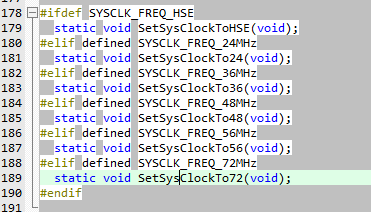 下面代码通过宏定义来选择配置系统时钟的函数,上边函数定义了SYSCLK_FREQ_72MHz,所以程序执行void SetSysClockTo72(void)。跳转到这个函数