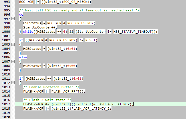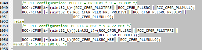 再看下图,跳过它上面的代码。else下的代码是通过配置寄存器设置锁相环,从锁相环出来的频率为9倍的频外部高速时钟。