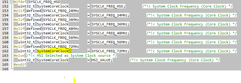 下面这段代码在时钟配置中没什么用,只是在以后的程序中可以通过SystemCoreClock来读出系统时钟的频率。