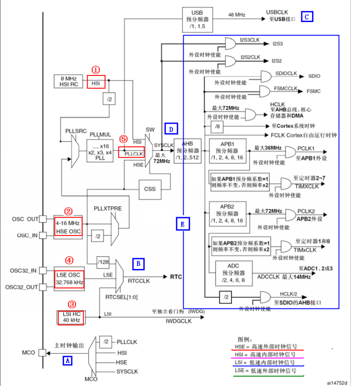 看懂时钟配置源代码,首先要弄懂时钟系统框图,两个时钟图差不多,但标注有点区别