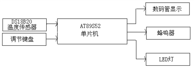 按键电路是用来实现调节设定报警温度的上下限和查看上下报警温度的功能。