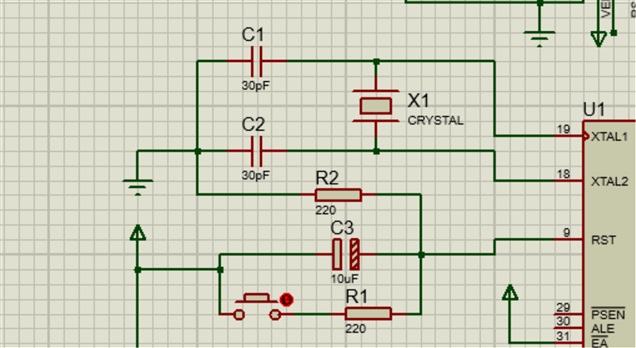 时钟电路有12MHz的晶振及两个2030PF的瓷片电容(无极性)连接在单片机的XTAL1及XTAL2连个端口;复位电路由10K的电阻, 10UF电解电容(有极性)以及按键开关组成,接在单片机的RST口。当系统出现故障错误,想让系统恢复初始化状态可以通过对按动按键开关实现对电容的充放电从而实现系统的复位。