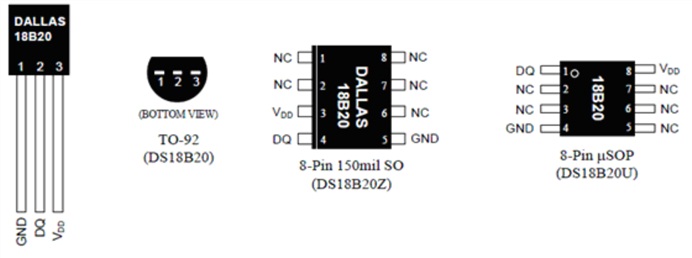 DS18B20采用3脚TO-92封装或8脚SO或μSOP封装,其其封装形式如图1-2所示。