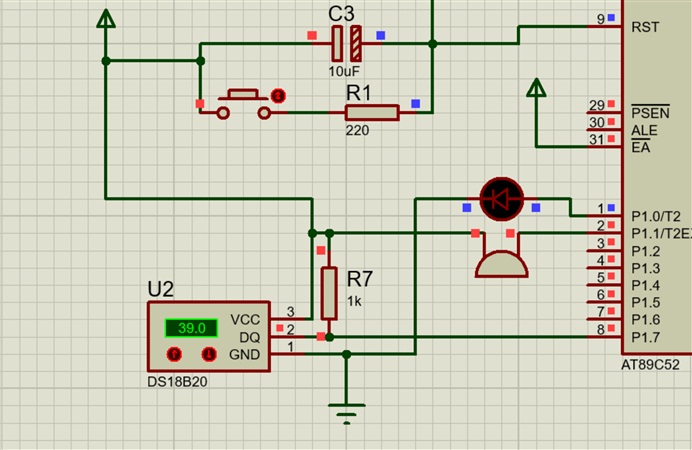蜂鸣器用于当温度传感器的输入的温度数值大于认为设定的上限温度或者小于下限温度时,系统会给出相应的信号使得蜂鸣器发出声音同时让LED灯闪烁显示,从听觉和视觉上同时提出报警信号。电路图如下: