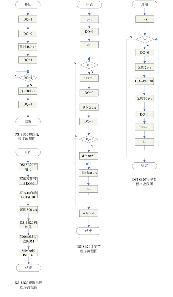 DS18B20的读字节,写字节,获取温度的程序流程图如图1-3所示。