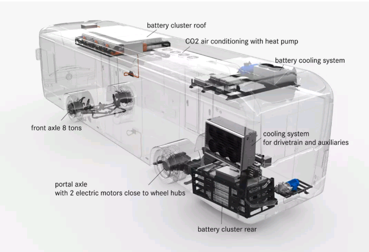 全电动梅赛德斯 eCitaro 是一辆城市公交车。它使用 ZF AVE 130 电动门式车桥,搭载轮毂电机。每台电机的峰值输出为 125kW,扭矩为 485Nm。动力来自总容量为 292kWh 的锂离子电池。电池封装在多达 12 个模块中。由于城市公交车的行驶条件,行驶里程从 106 英里(夏天空调运行)到 174 英里(理想条件下)。