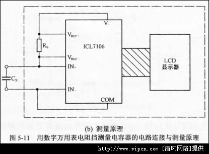 式(5-2)标明,刚接通电路时,t=0,VIN=E,数字万用表开始显示值即为电池电压,尔后随着Vc(t)的长高,VIN(t)逐渐降低,直到VIN=0V,Cx充电进程完毕,此时
